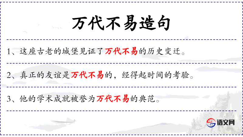 - 相关成语:“千古流传”、“永垂不朽”等,都与“万代不易”有相似的文化内涵。