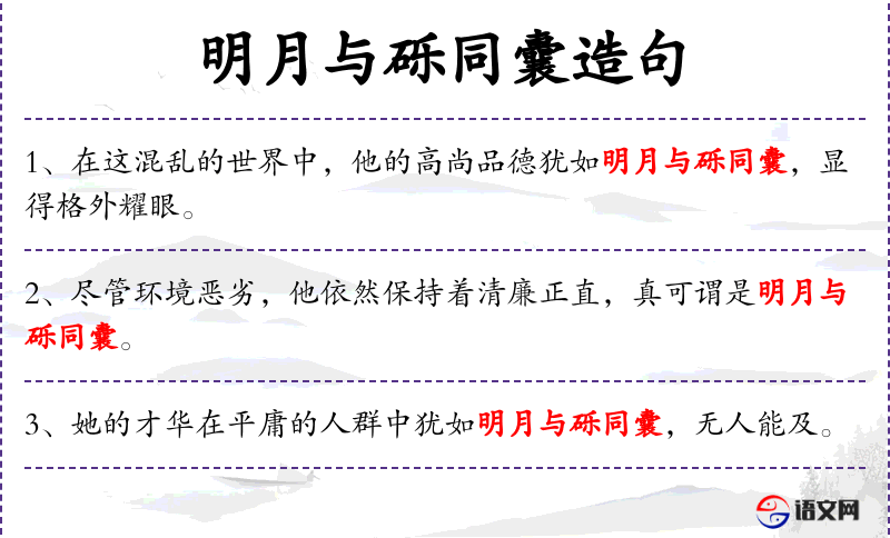 句子中的“明月与砾同囊”是一个比喻,源自古代文学,用来形容在混杂的环境中某物或某人显得格外突出。这个比喻蕴含了文化中对对比和突出的审美偏好。