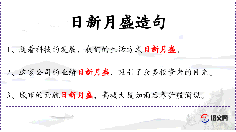 1. 【日新月盛】 每天每月都有变化、增加。形容不断发展。