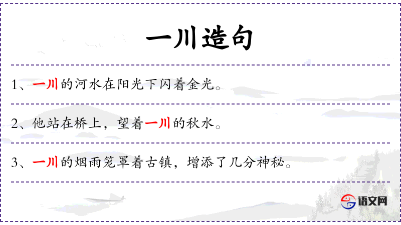 1. 【一川】 - 一条河流; 一片平川;满地。多用于形容自然景色。