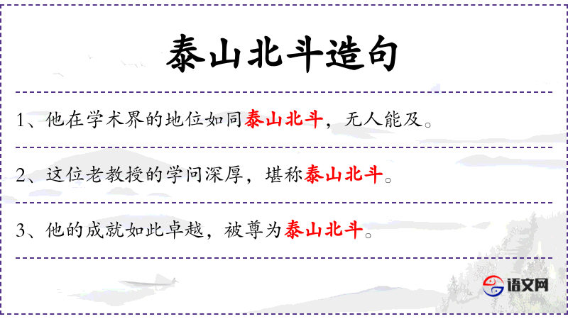 2. 【泰山北斗】 泰山:东岳,在山东省泰安市;北斗:北斗星。比喻道德高、名望重或有卓越成就为众人所敬仰的人。