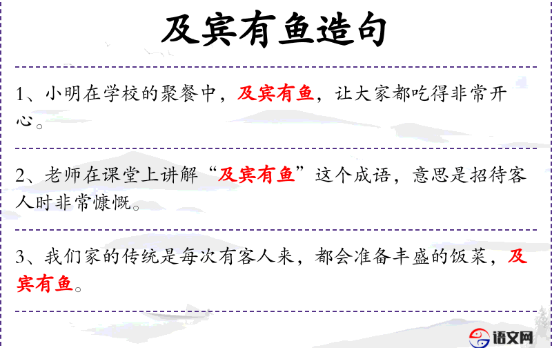 - 及宾有鱼:成语,意为招待客人时有鱼,表示招待周到。