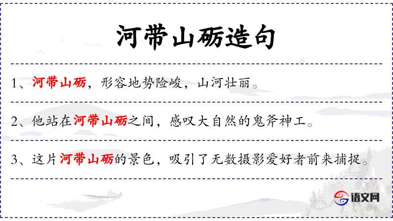 6. 【河带山砺】 河:黄河;带:衣带;山:泰山;砺:磨刀石。黄河像条衣带,泰山像块磨刀石。比喻经历的时间久远。