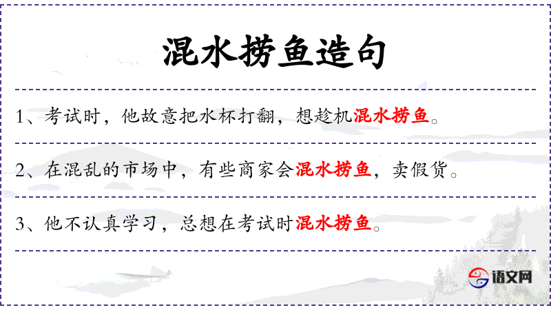 1. 【混水捞鱼】 - 比喻乘混乱的时候从中捞取利益。同“混水摸鱼”。