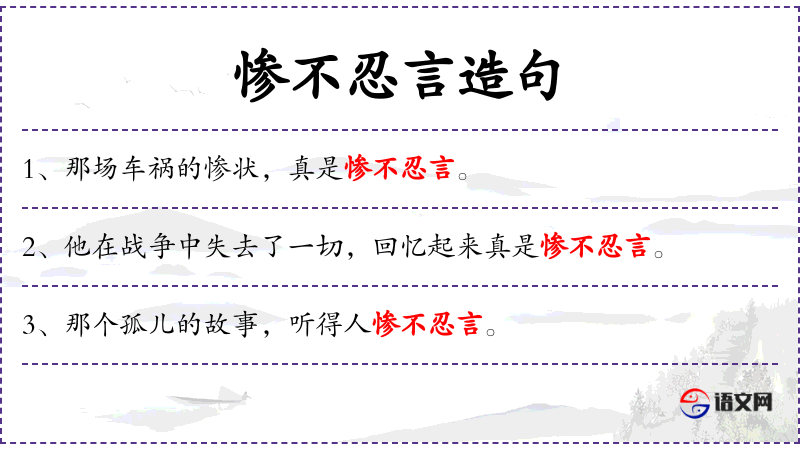- 宾语:“惨不忍言”,是一个形容词短语,用来描述主语的状态。