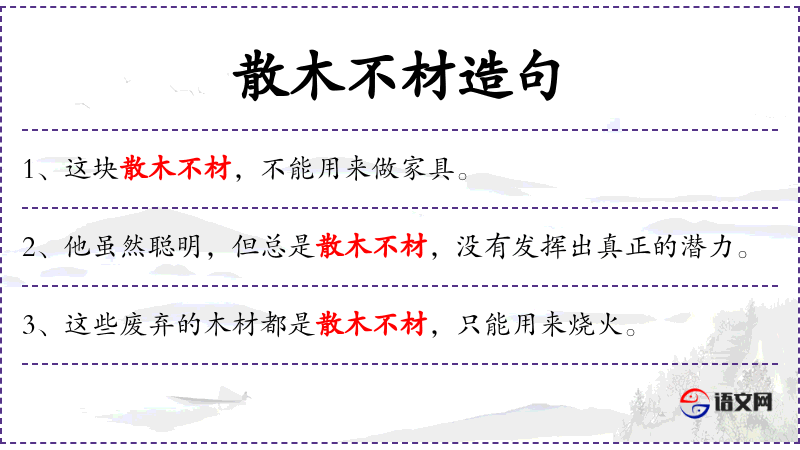 - 成语典故:“散木不材”源自《庄子·逍遥游》,原文是“散木也,以为舟则沈,以为棺椁则速腐,以为器则速毁,以为门户则液樠,以为柱则蠹。是不材之木也,无所可用,故能若是之寿。”