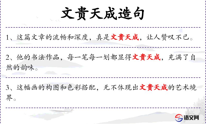 句子中的“文贵天成”可能源自**传统文化中对文学作品自然流畅的赞美。这种表达方式体现了对文学创作自然性和艺术性的重视。