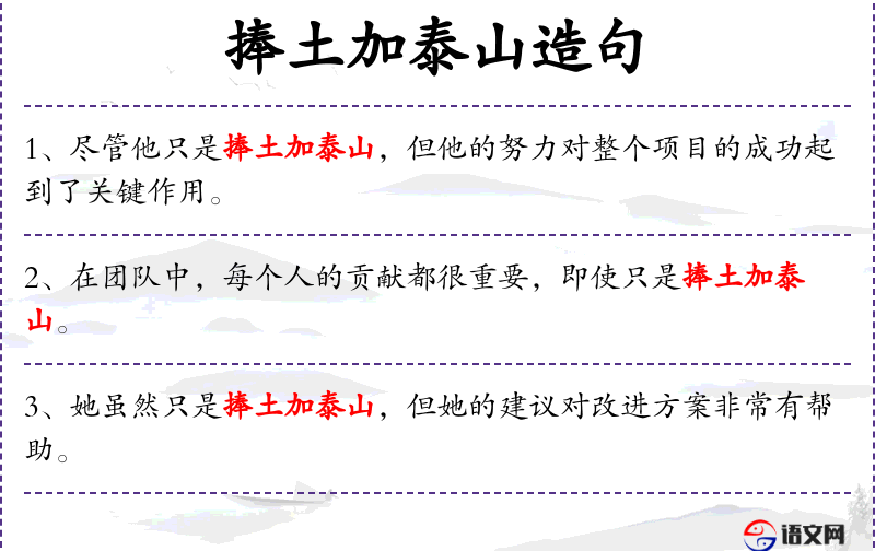 句子中的“捧土加泰山”是一个**成语,源自《左传·僖公二十五年》:“泰山不让土壤,故能成其大;河海不择细流,故能就其深。”这个成语强调了即使是微小的贡献,也是构成整体不可或缺的一部分。