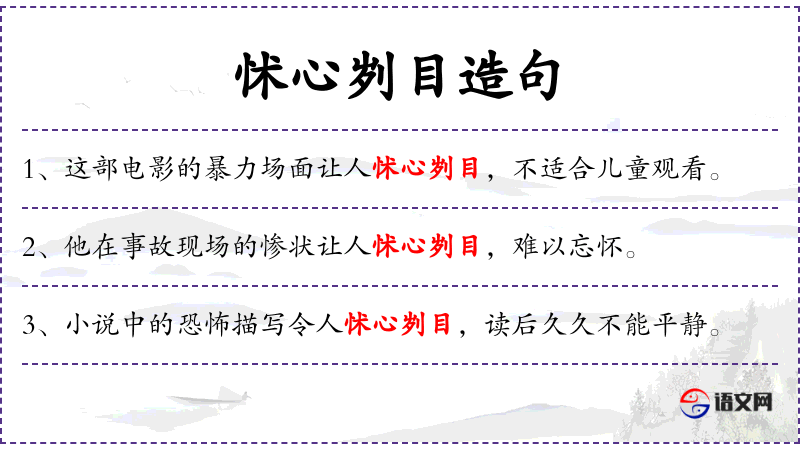 - 怵心刿目:形容景象极其悲惨,让人心惊肉跳,不忍直视。