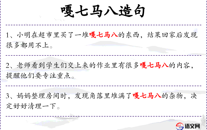 - 状语:“家里客厅的装饰品太多,显得嘎七马八”