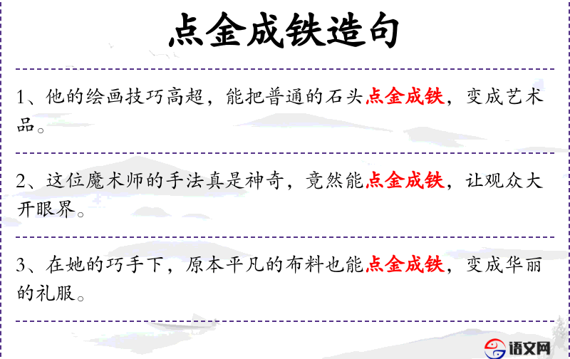 5. 【点金成铁】 - 用以比喻把好文章改坏。也比喻把好事办坏。