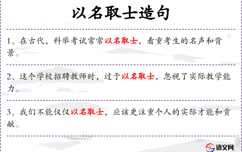 1. 【以名取士】 名:名声;取:取用。依据名望的高低作为选用人才的标准。