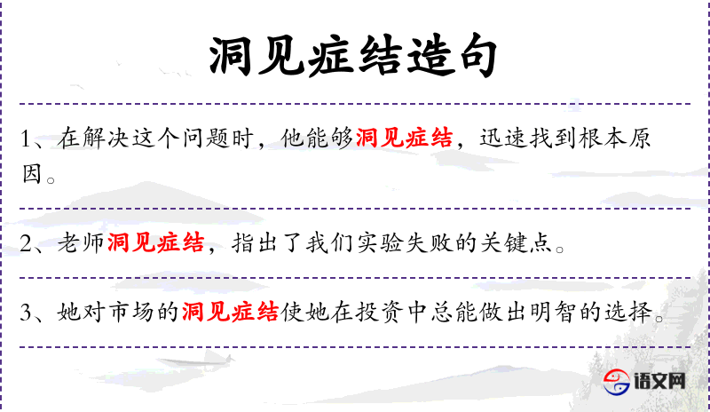 4. 【洞见症结】 洞见:清楚地看到;症结:肚子里结块的病,比喻问题的关键。比喻事情的纠葛或问题的关键所在。形容观察锐利,看到了问题的关键。