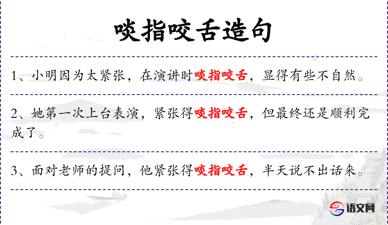 句子:“在全班同学面前做报告,他啖指咬舌,显得非常紧张。”