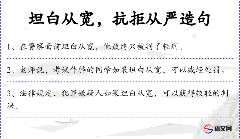 - 坦白从宽:法律术语,指犯罪者主动坦白自己的罪行,可以获得较轻的处罚。