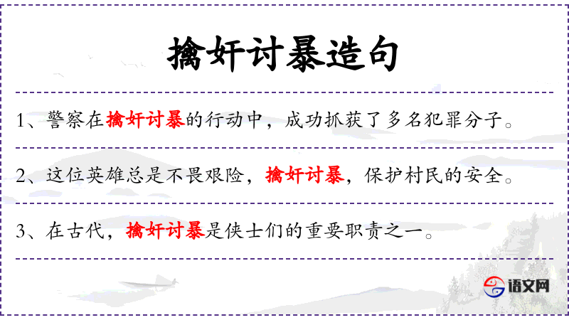 - 擒奸讨暴:成语,意为捉拿坏人,讨伐暴行。