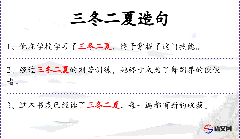 “三冬二夏”是一个成语,源自古代的计时方式,用来形容时间的长久。这个成语体现了文化中对时间的特殊表达方式。
