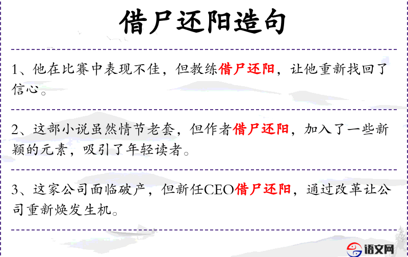 - “借尸还阳”这一成语的使用增加了句子的文化深度和隐含意义。