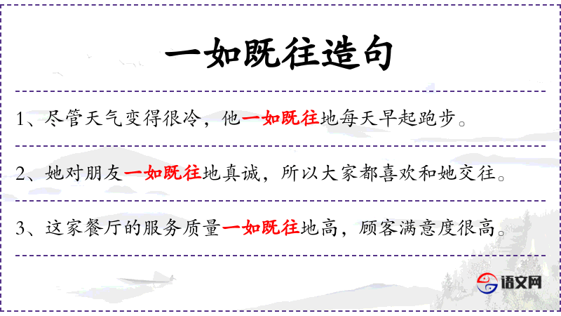 • 状语:一如既往地、认真、因此