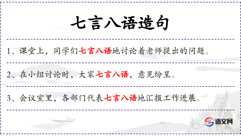 - 七言八语:形容人多嘴杂,各自说话,场面热闹。
