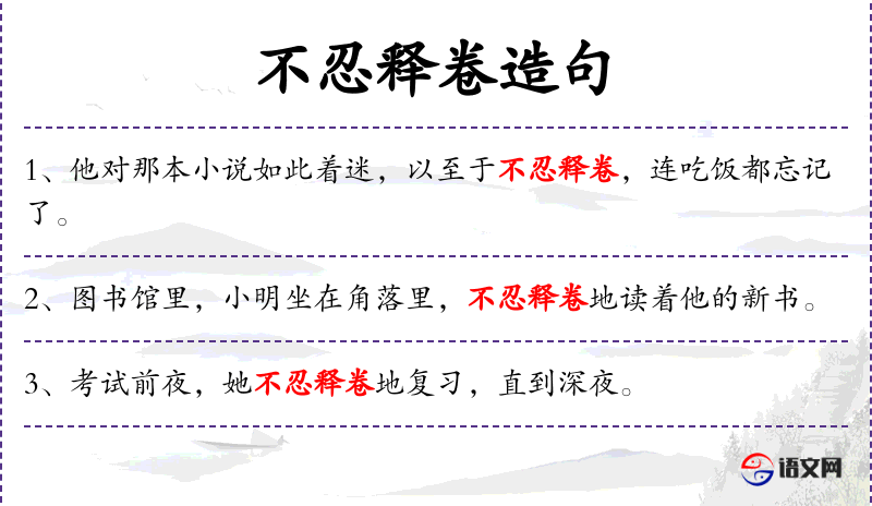 - 不忍释卷:成语,形容读书非常投入,舍不得放下书卷。