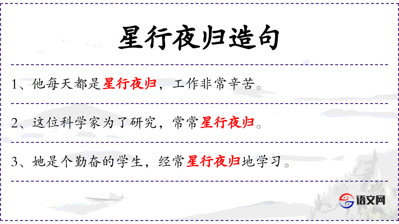 “星行夜归”是一个成语,源自*古代文学,形容人勤奋工作或学,晚上很晚才回家。这个成语体现了**文化中对勤奋和努力的重视。