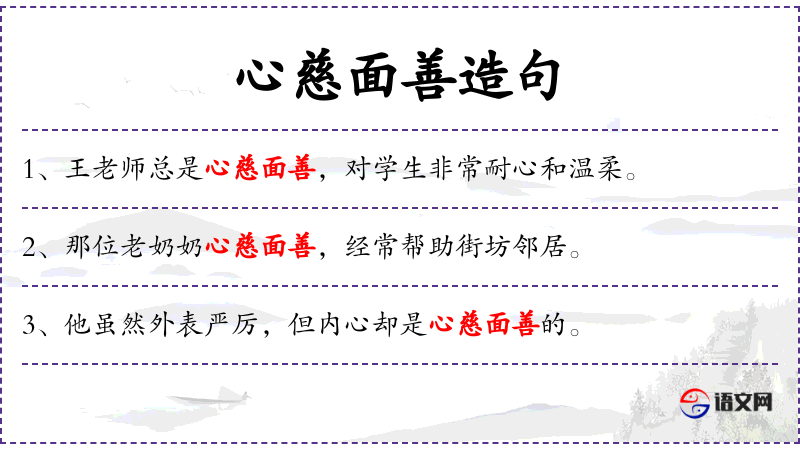 句子:“心慈面善的她,无论遇到什么困难,总是保持乐观的态度。”