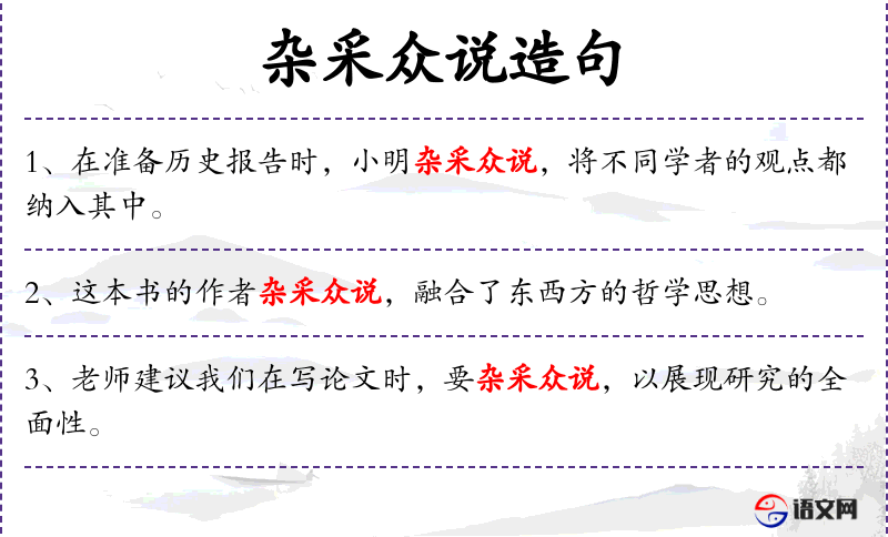 3. 【杂采众说】 杂:多种多样地;采:采碑,采纳。广泛地采纳众家学说、说法