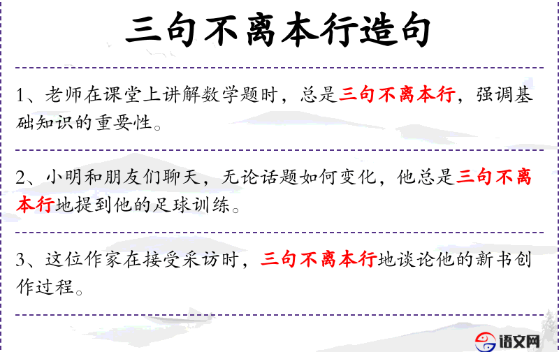- 三句不离本行:成语,意思是说话总是离不开自己的专业或熟悉的话题。