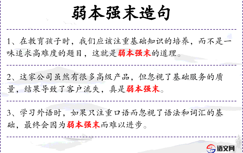 句子:“在教育孩子时,我们应该注重基础知识的培养,而不是一味追求高难度的题目,这就是弱本强末的道理。”