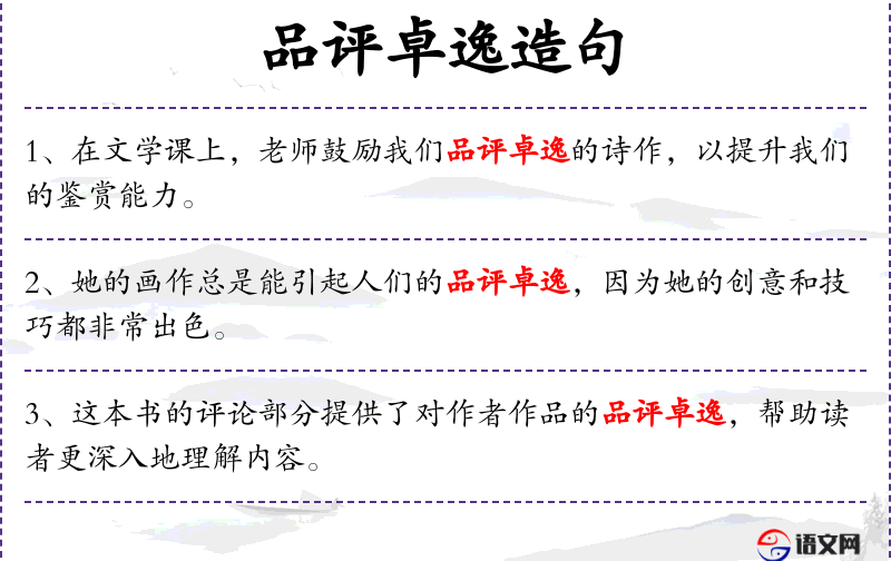 - 品评卓逸:这个词组意味着评价非常高且出色。