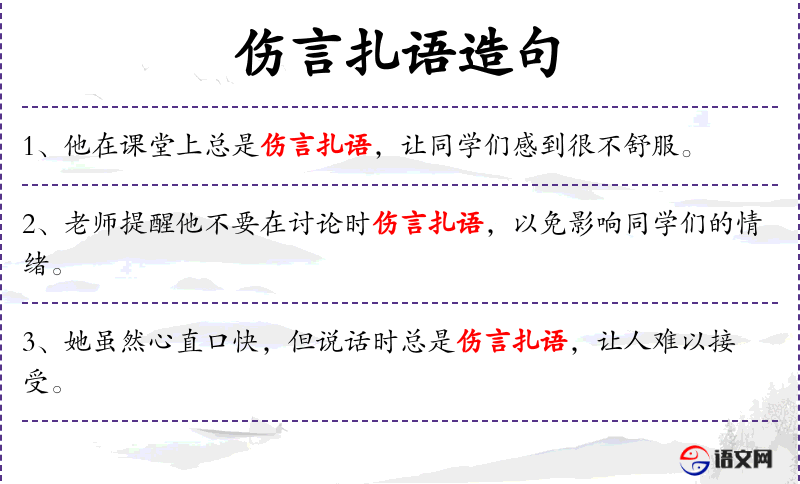 - 伤言扎语:指说话伤人,用词尖锐或刻*。