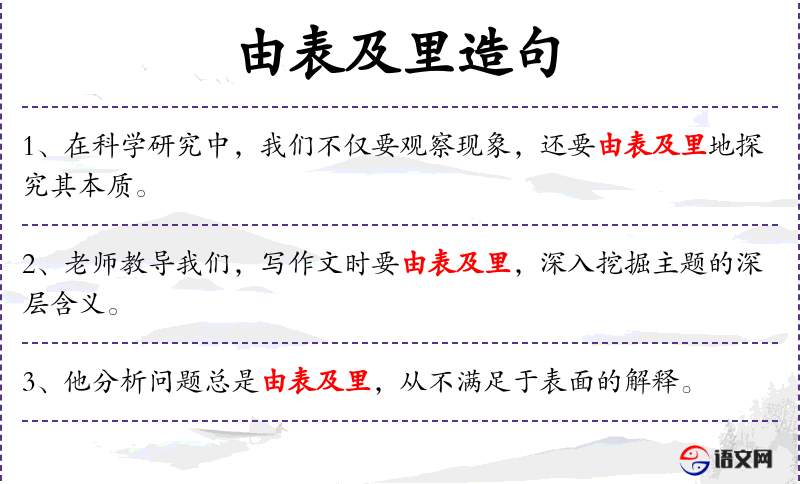 4. 【由表及里】 - 表:表面;里:本质。从表面现象看到本质。