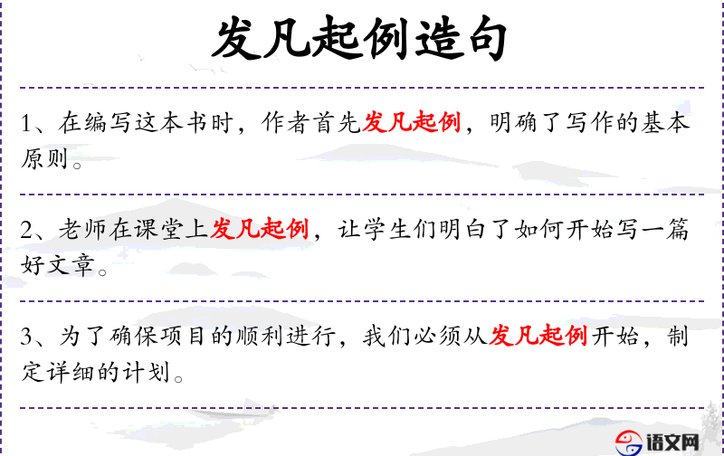 - 在课堂上,老师通过发凡起例的方式,使学生们掌握了如何开始写一篇好文章。