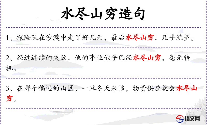 3. 【水尽山穷】 穷:尽。山和水都到了尽头。比喻无路可走陷入绝境。