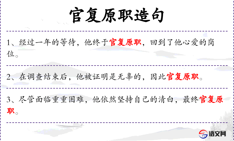 在**文化中,“官复原职”可能与政治或官僚体系中的升降有关,反映了人们对公正和恢复原状的期望。这个成语也体现了对个人努力和坚持的认可。