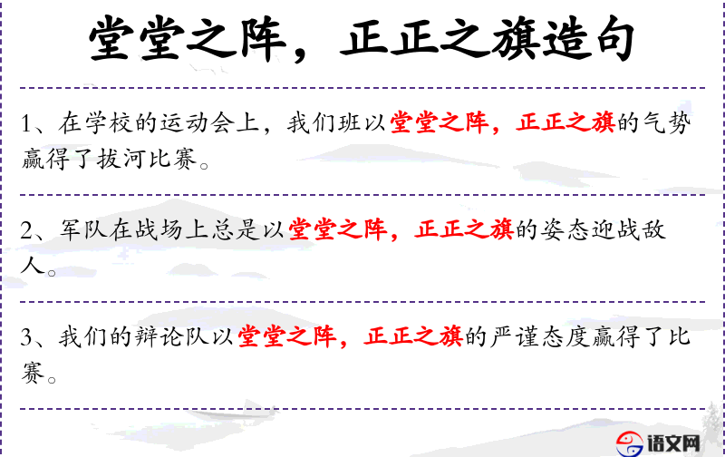 - 状语:在历史剧的演出中,以堂堂之阵,正正之旗的表演