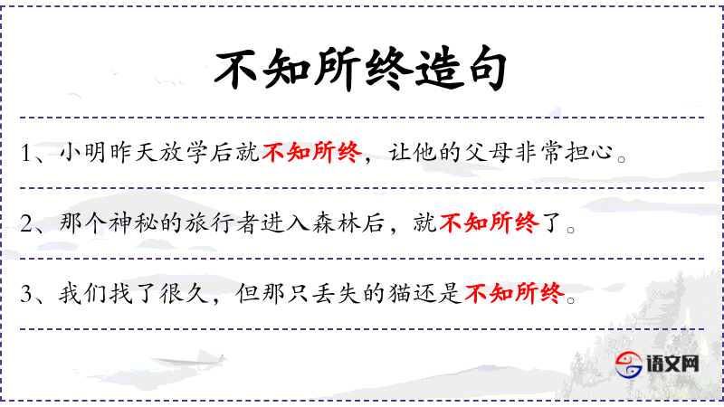 - 成语“不知所终”反映了人们对未知和结局的好奇和担忧。