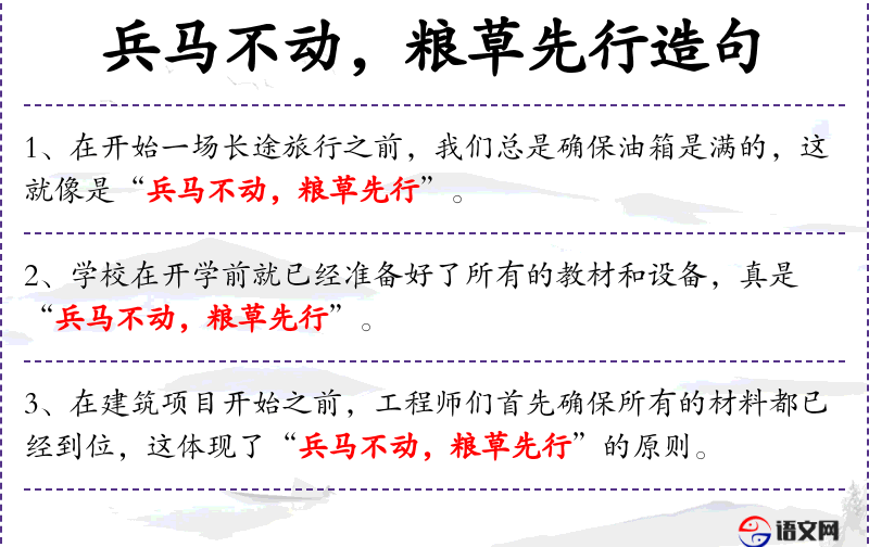 - 兵马不动,粮草先行:成语,比喻在做某事之前,先做好准备工作。