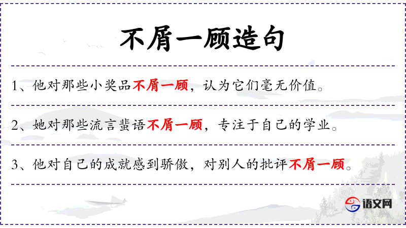 - 不屑一顾:成语,表示对某事物不感兴趣或认为不值得一看。