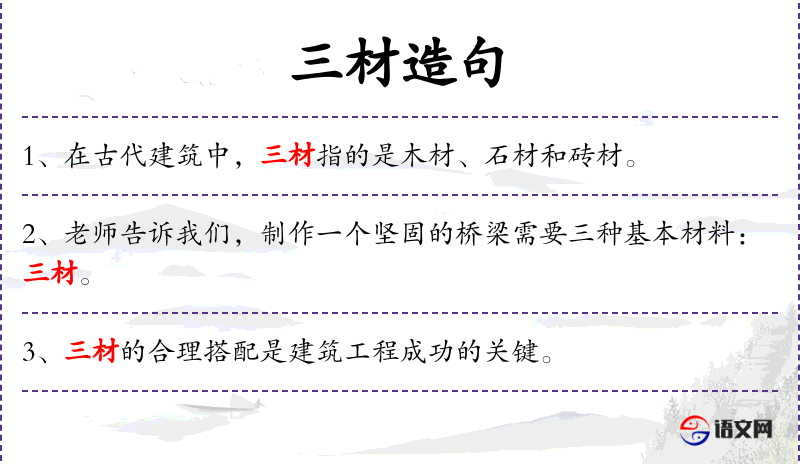 1. 【三材】 指天﹑地﹑人; 三种人材官人使吏之材,士大夫官师之材,卿相辅佐之材; 三位辅弼之才; 三种材料。制作车轮的三种木材; 三种材料。指制弓的胶﹑丝﹑漆; 三种材料。古代指炊事必备的水﹑木﹑火。