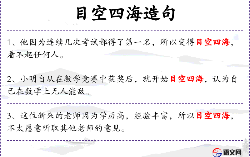 3. 【目空四海】 - 四海:指全国各地。眼看四海之内皆空。比喻目中无人、狂妄或自负之甚。
