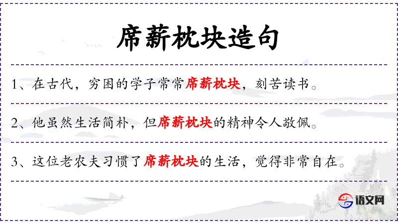 - 状语:尽管条件艰苦,依然席薪枕块