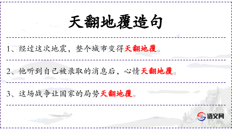 - 补语:“天翻地覆”,用以强调改变的巨大程度。