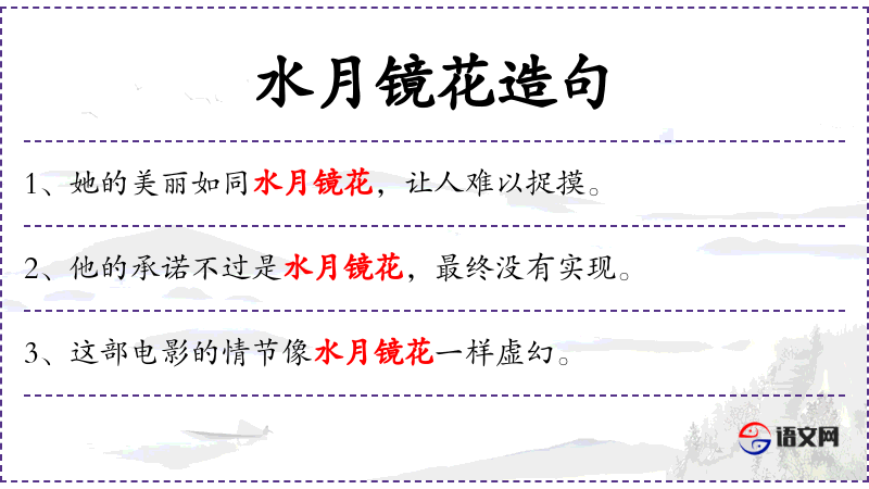 5. 【水月镜花】 - 水中月,镜中花。比喻虚幻景象。
