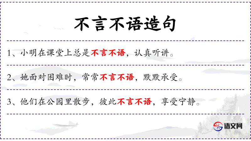 - 相关成语:“不言而喻”(不需要说出来就能明白)与“不言不语”有相似之处,都强调了沉默的意义。