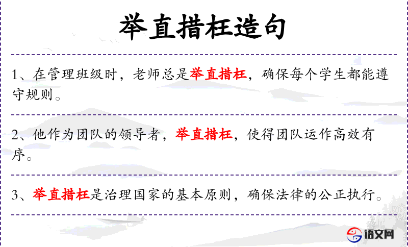 - 举直措枉:意为采取正确措施纠正错误,是一个成语,形容处理问题果断且正确。