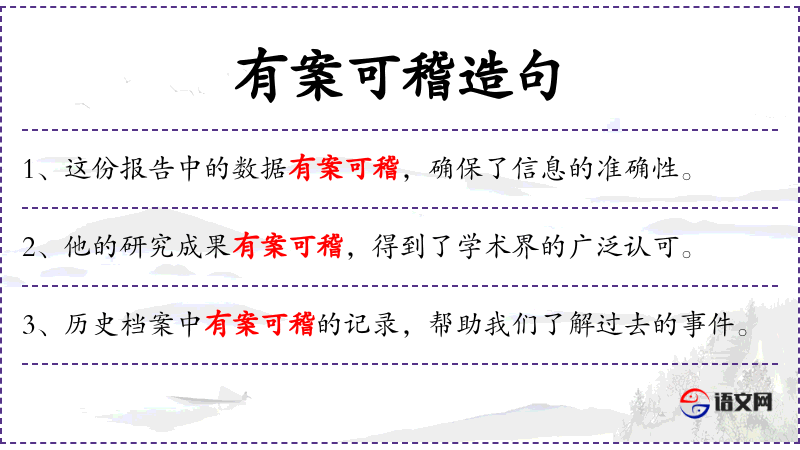 1. 【有案可稽】 - 案:案卷,文件;稽:查考。指有证据可查。