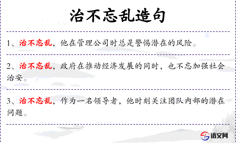 1. 【治不忘乱】 - 治:安定。国家太平安定的时候不能忘记防止可能出现的动乱。