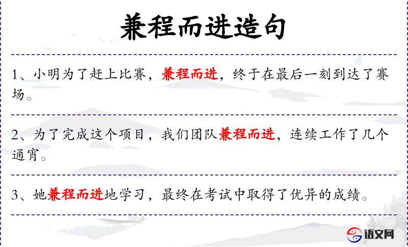 • “兼程而进”是一个中文成语,体现了中文文化中对努力和效率的重视。